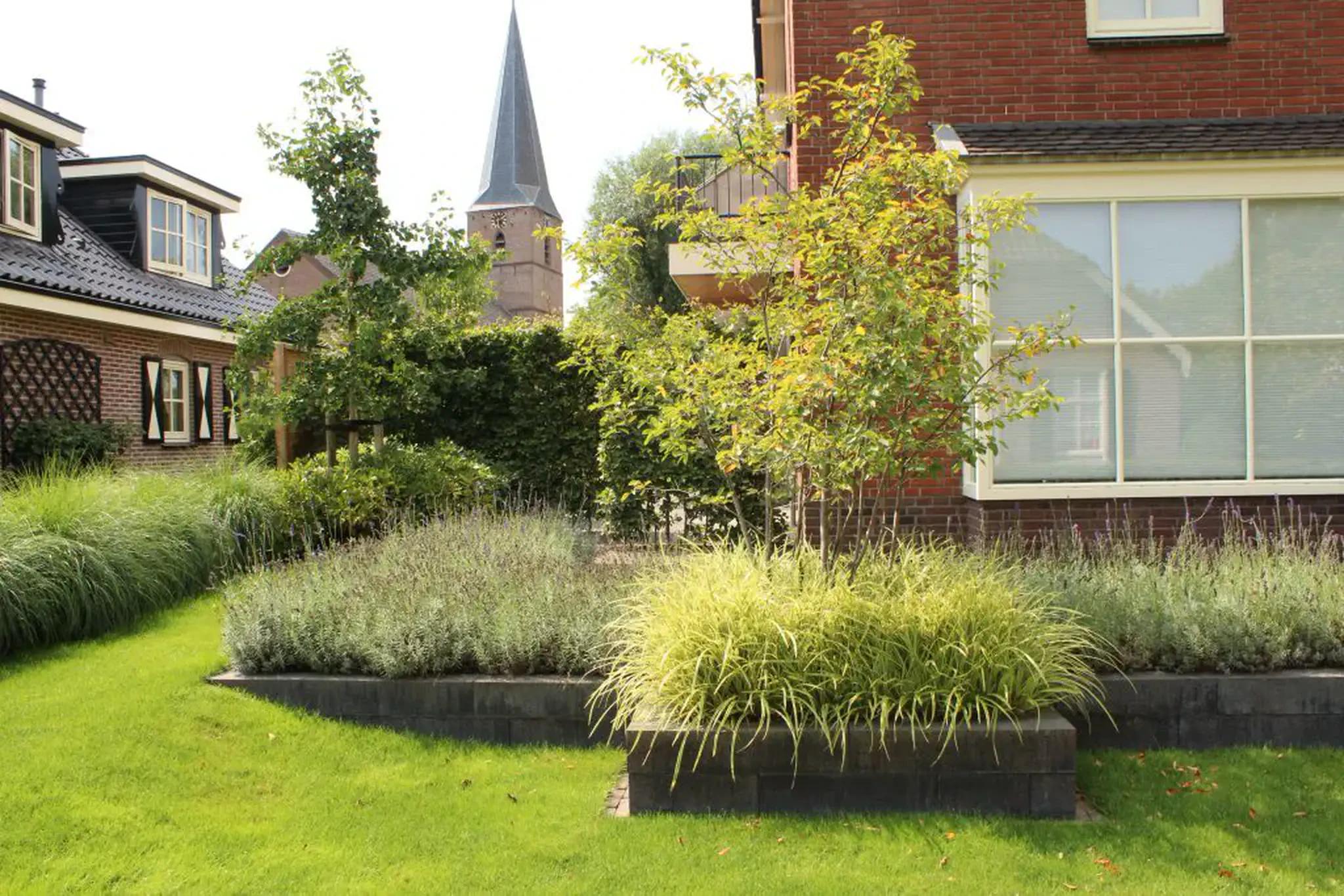 De afscheiding van de voor- en achtertuin wordt gedaan door een beukenhaag en een hout beton afscheiding afgewisseld met steenkorven. Bij de achterdeur is een patio gecreëerd zodat je hier even kan zitten in de schaduw van de dak leibeuken. Door de oprit in de achtertuin in het verlengde van de schuur te leggen wordt deze aan het zicht onttrokken vanuit de woning. De lange zichtlijn vanaf de woning de achtertuin in wordt benadrukt door een lang gerekte verhoogde spiegelvijver. De spiegel vijver is geheel gestuct, met een mooie oud Hollandse afdekrand en voorzien van een filtersysteem om het water helder te houden. Deze keuze van de afdekrand komt tevens terug in de bestrating van Oud Hollandse 80x80cm tegels voor de terrassen en paden van gebakken waalformaten. De oprit is weer voorzien van gebakken dikformaat ter contrast.