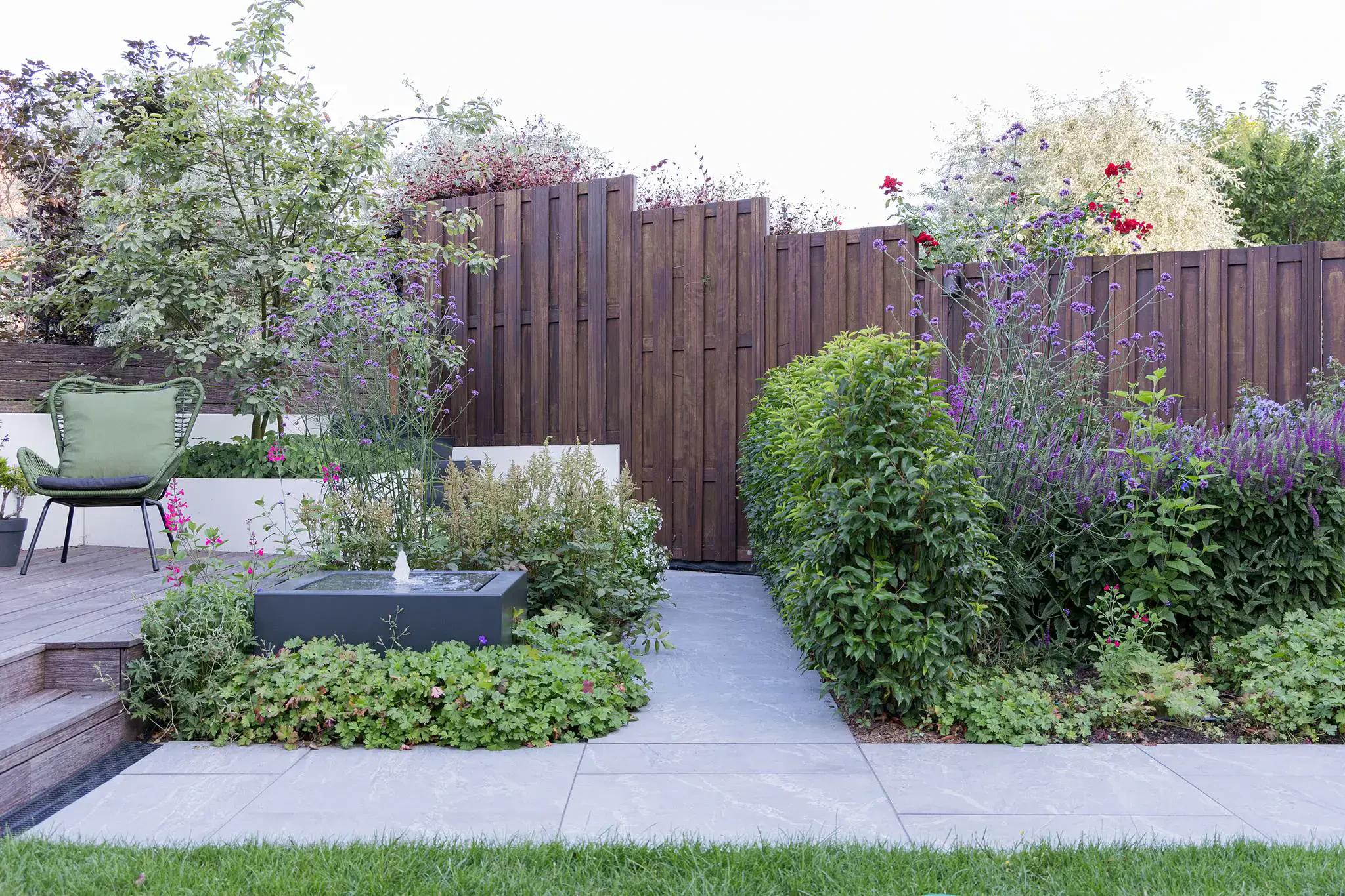 Gezien de locatie van het verhoogde avondterras en de toegang van de tuin vanuit de woning is gekozen voor een diagonaal pad waar langs waterelementen zijn aangebracht. Een ruim terras tegen de woning in de schaduw voor de eettafel. Aan de rechterzijde van de tuin een vaste planten border welke gaat zorgen voor de nodige kleur in de tuin evenals in de verhoogde plantenbakken bij de verhoogde vlonder.