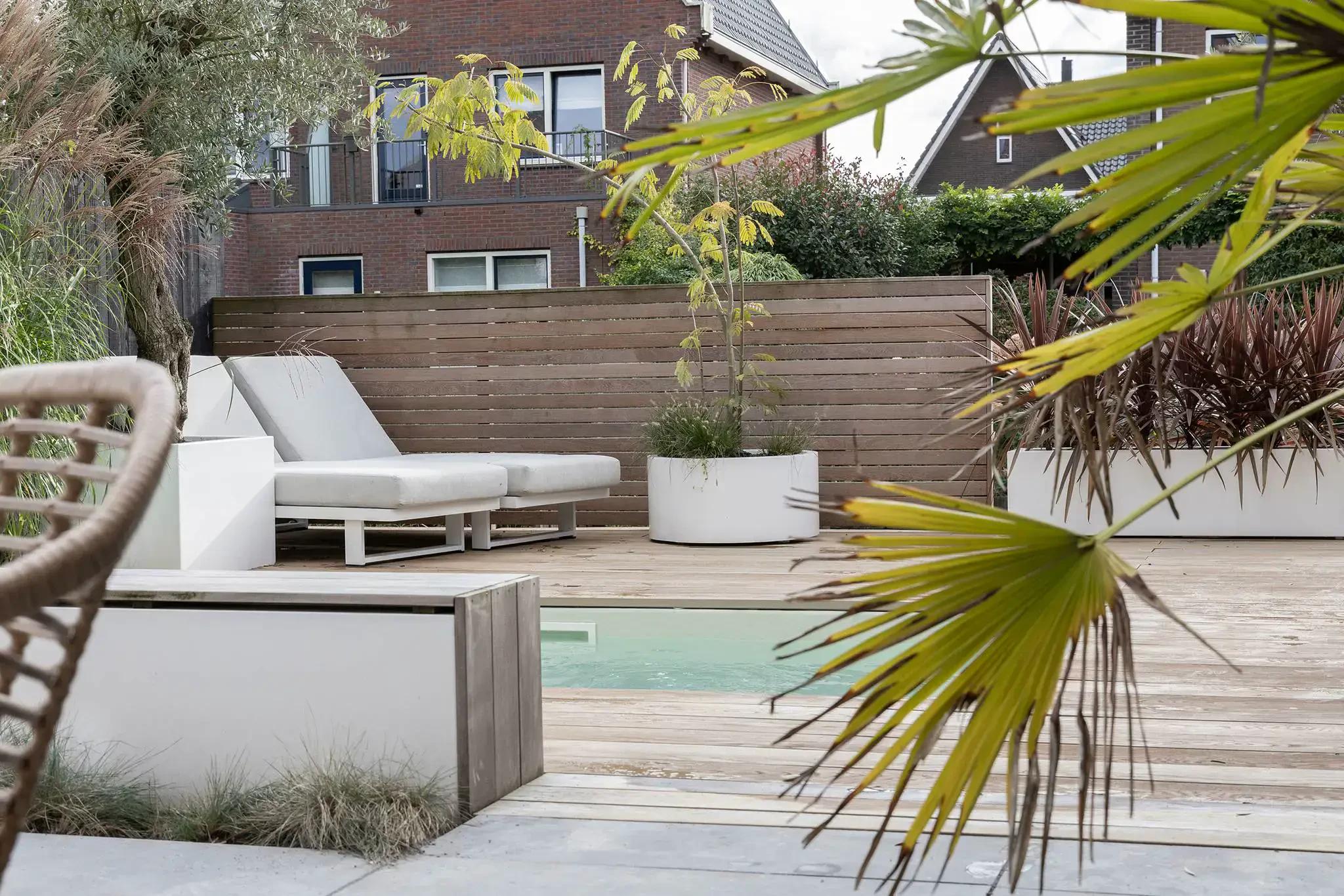 Voor de toepassing van de vlonder zijn meerdere opties afgewogen en uiteindelijk is voor de high-end vlonderplank van Millboard gekozen. Deze plank bestaat uit composiet en is niet te onderscheiden van echt hout. Deze plank maakt deze tuin echt af.