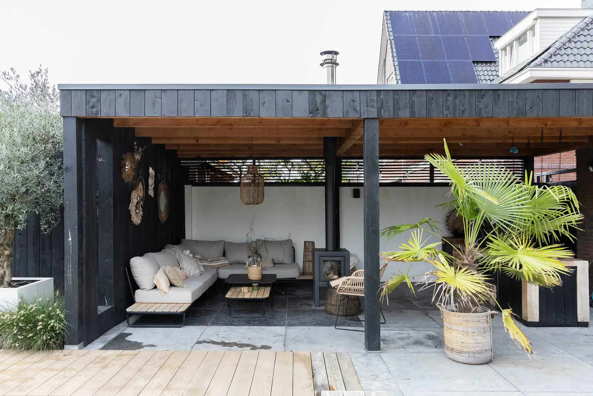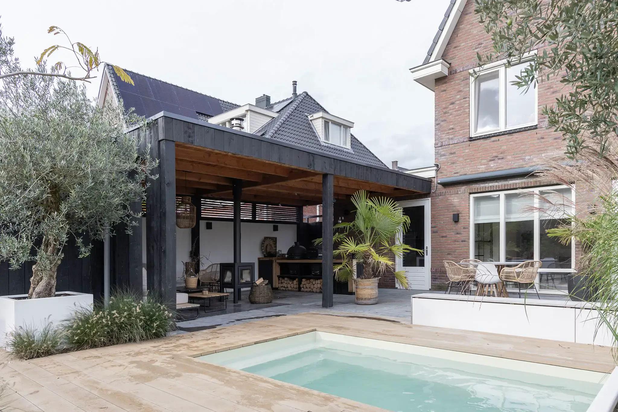 De nieuwe indeling van de tuin is zo ingericht dat de plungepool gedurende de dag optimaal gebruikt kan worden. De overkapping is aangesloten op de achterdeur, zodat de bewoners ongeacht het weer een droge doorloop hebben. De veranda is boven de bestaande muurzijde uitgevoerd met ter plaatsen gemaakte shutters. Aangrenzend aan de overkapping is een berging van douglas verticale planken gemaakt voor opslag en voor het afschermen van het plungepool-pompsysteem.